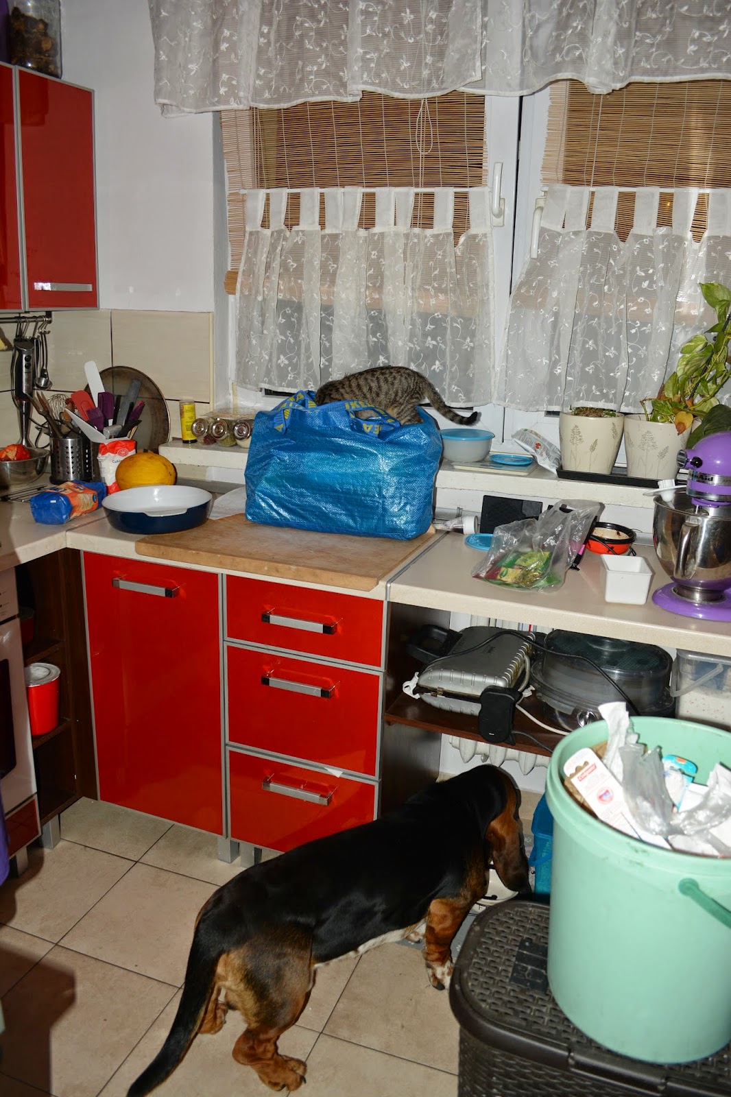Powrót do domku był szybki i sprawny, bez żadnych fochów LaBuni. W domku czekała na nas Fuksja i tradycyjnie wyszła nam na przywitanie po otwarciu drzwi i ostentacyjnie udaje, że mnie wprowadza trzymając zębami smycz. No niech ma trochę radości z życia i nie będę psuł jej marzeń i dobrej zabawy. W domku ja głównie spałem, a Fuksja się bawiła i zwiedzała całe mieszkanko, oczywiście oprócz sypialni. Ta pozostaje dla nas zamknięta przez cały dzień aż do nocy.