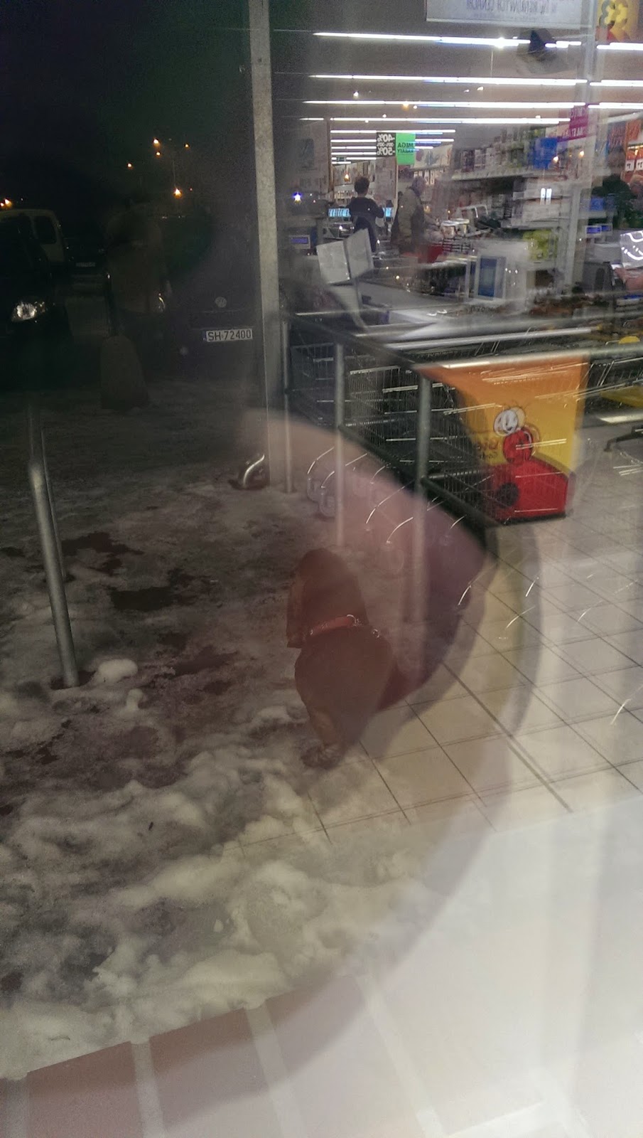 Gdy chruściki w końcu były gotowe, a ja w zasadzie wyspany i najedzony. Zjadłem obiadek i w zasadzie chwilkę pobawiłem się z Fuksją i ledwo się ściemniło, a już musieliśmy iść. Poszliśmy po Panią. LaBunia została pod domkiem a my dreptaliśmy po zbitym i zmrożonym śniegu, który wcześniej topniał z powodu plusowych temperatur. Droga do Pani zajmuje nam kilka minut. Chwilkę musieliśmy na nią poczekać aż się zbierze i poszliśmy na malutkie zakupy do pobliskiego, nowo otwartego sklepu. Oczywiście ja musiałem poszczekać przed sklepem, bo z pieskiem nie wolno. W zasadzie z pieskiem to jedynie można się przespacerować po chodniku lub do parku ale to zawsze na smyczy i tyle. Zupełnie nie rozumie dla czego nie mogę wejść ze swoim Panem do centrum handlowego pooglądać ciuchy, albo do muzeum czy też restauracji. Przecież jak jest się grzecznym pieskiem takim jak ja to nic złego się nie zrobi, a w restauracji to bym zjadł za dziesięć osób.